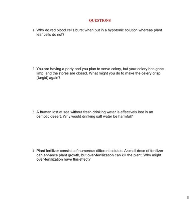 How many animals are killed each year due to animal testing? Therefore, option (c) is correct. Well normally,when you place a bacterium in a hypotonic solution,it ruptures by swelling due to the osmotic gradient. Pickles, jams, jellies and squashes are kept in hypertonic solution of sugar or salt which causes the question 4: Slight fluctuations in the solute concentration of the extracellular fluid throughout the day cause small amounts of water to be exchanged between the intracellular and extracellular compartments to maintain homeostasis.